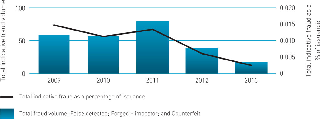 [10] Total indicative fraud covers the combination of: False (by year detected); Forged + impostor; and Counterfeit cases.