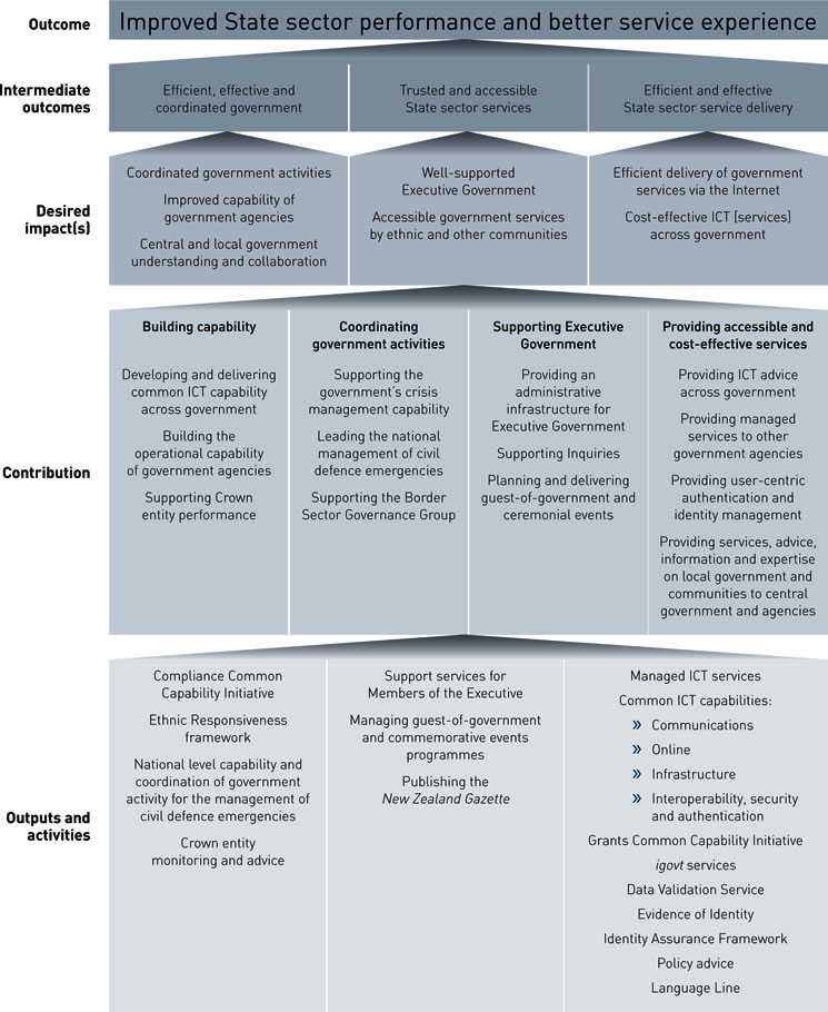 This is a new outcome for the Department, developed to reflect our increasing role in supporting other State sector agencies to deliver better services cost-effectively. It incorporates the two departmental objectives described in previous Statements of Intent: Common ICT services deliver improved State sector performance and better citizen experience; and Executive Government is well supported.