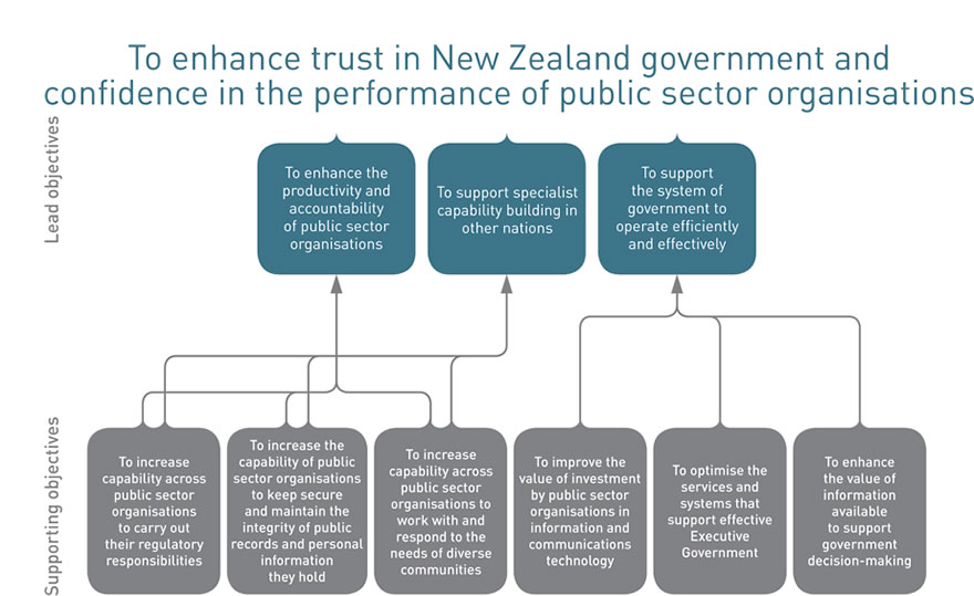 The Department’s activities also support the system of government to operate efficiently and effectively. Internal Affairs provides support across government, including providing support for Executive Government and administering the framework for local government. It is also the lead advisor and standard setter for information management and technology use in the public sector. The Department also provides a range of information and advice to support government decision-making. By working with public sector organisations and shaping the infrastructure that supports the operation of government (including local government), Internal Affairs seeks to improve the capability and capacity of government agencies, their overall performance, and their ability to achieve results for the New Zealand public.